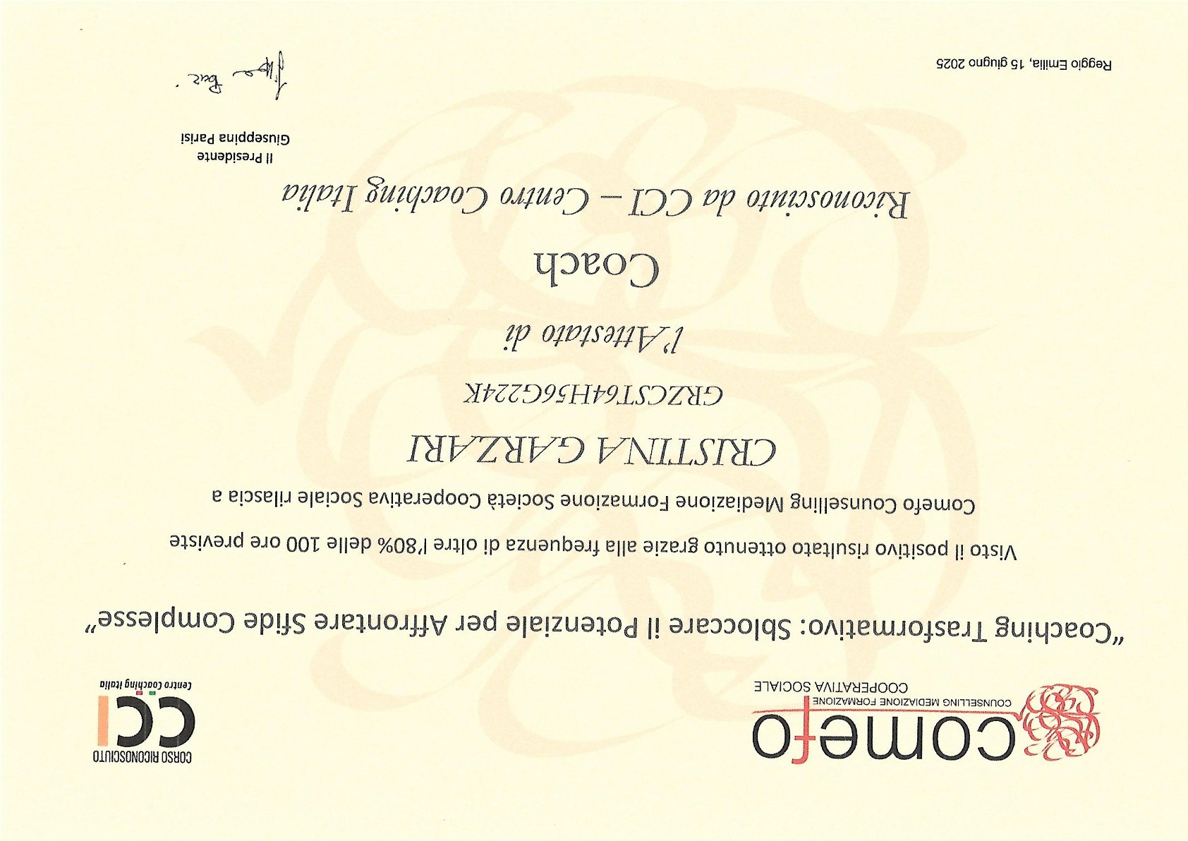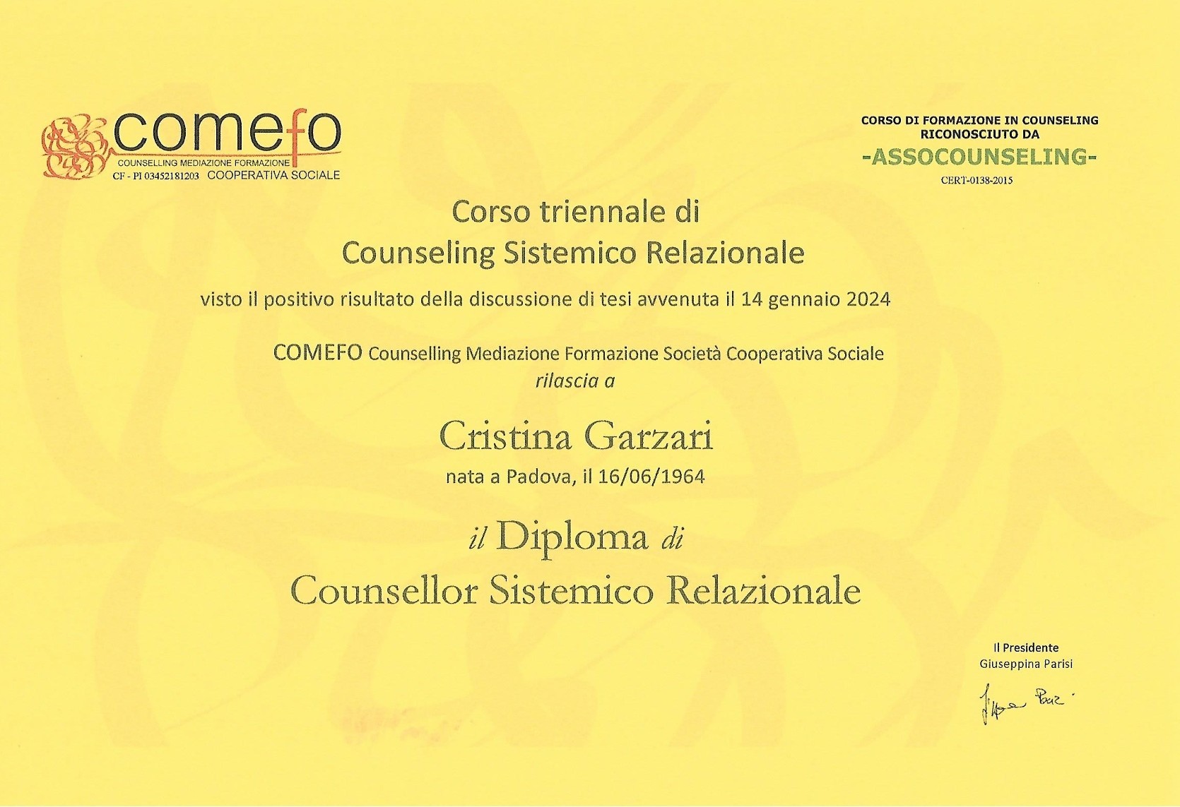 Diploma di Counselor Sistemico Relazionale - Rilasciato da CO.ME.FO